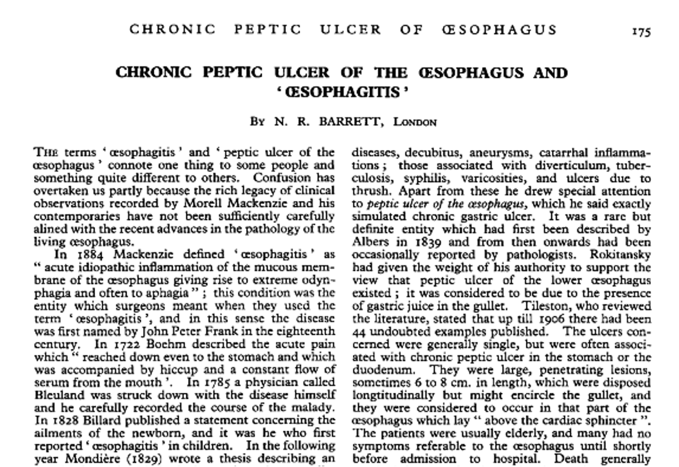 The condition bears the name of Norman Barrett, an Australian-born British surgeon working at St Thomas’ Hospital in London. In 1950, he published a paper describing an unusual finding: columnar epithelium (intestine-like cells) lining the lower oesophagus.