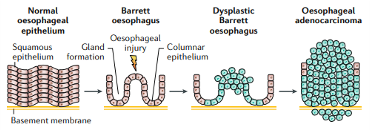 These changed cells can, over many years, develop further abnormalities. The sequence runs: normal cells → metaplasia (Barrett’s) → dysplasia (pre-cancerous changes) → adenocarcinoma.